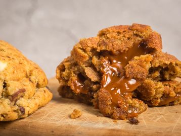 A perfectly chewy cookie with a tangy sourdough twist, rich caramel swirls and a touch of sea salt for the ultimate sweet-salty bite.
